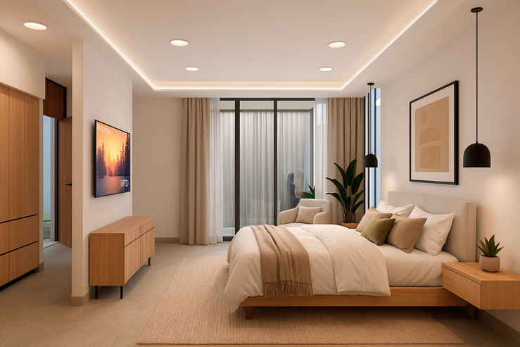La luz natural fluye a través de los ventanales de piso a techo, mientras la iluminación indirecta en plafón refuerza la sensación de amplitud y serenidad.